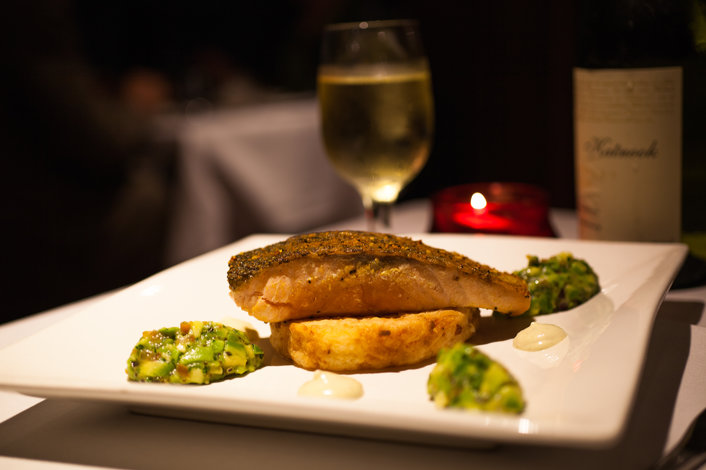 Crispy Skinned Moroccan Salmon Fillet with pimenton served with potato and seasonal vegetables